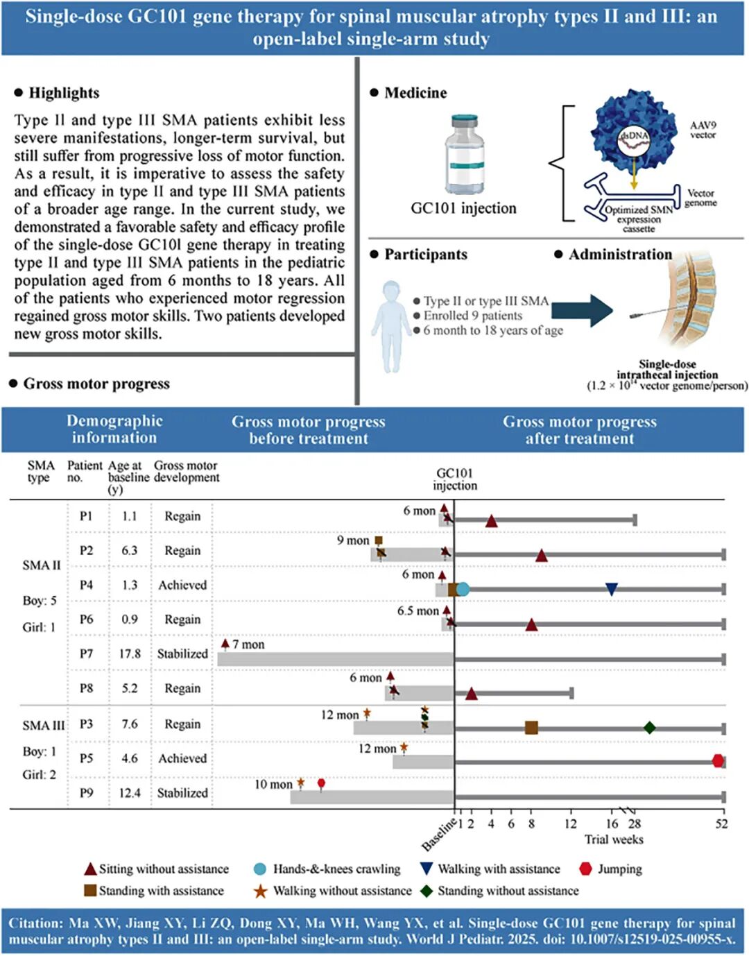 近日,锦篮基因创始人吴小兵教授作为联合通讯作者,与中国人民解放军总医院第七医学中心临床研究团队共同在国际知名儿科期刊《World Journal of Pediatrics》上发表了题为 《Single-dose GC101 gene therapy for spinal muscular atrophy types II and III: an open-label single-arm study》 的重要学术论文,为GC101在更广泛SMA患者群体中的应用提供了坚实的科学依据。